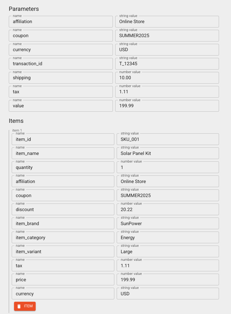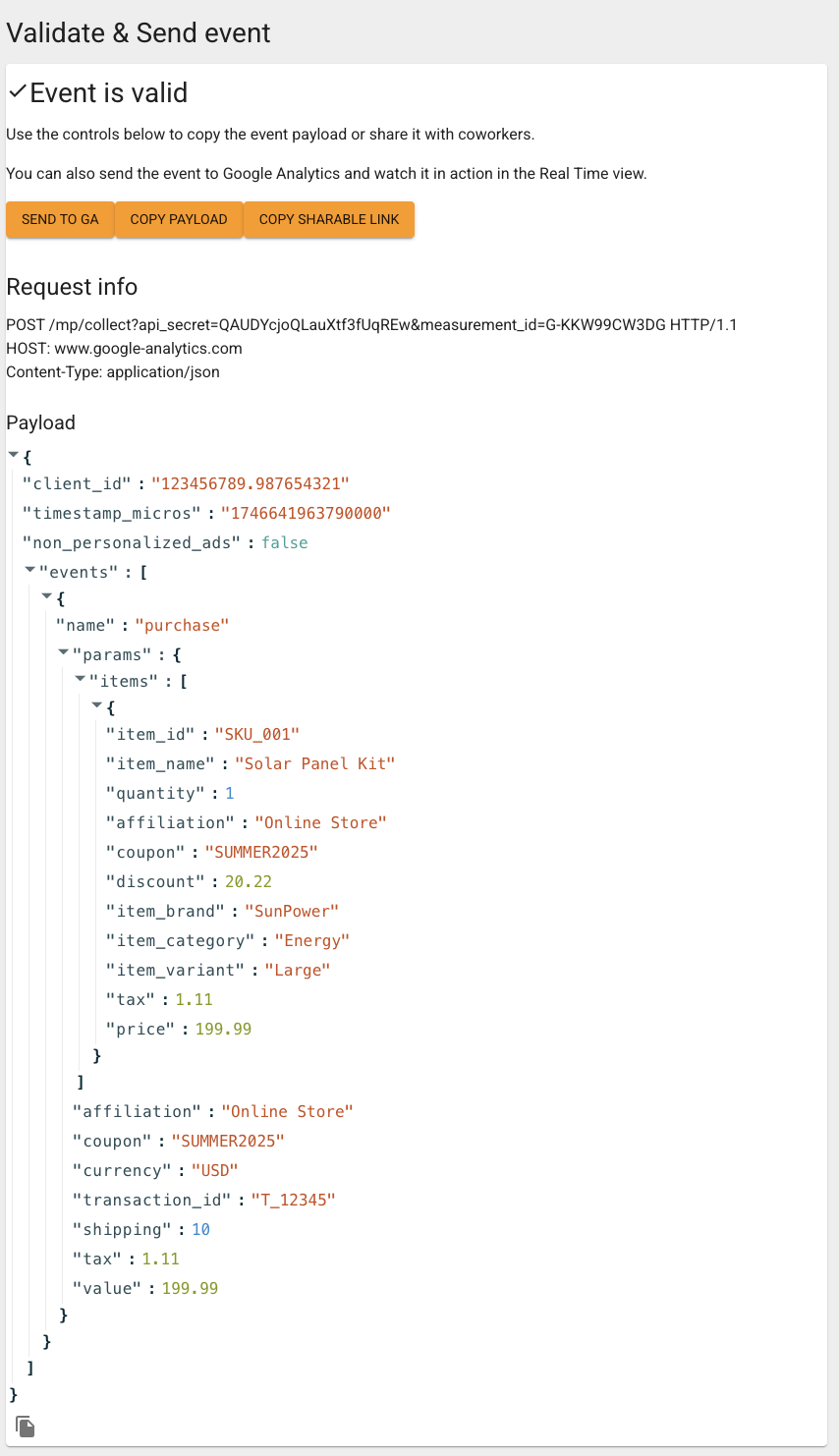 * Протестировать JSON через [GA4 Event Builder](https://ga-dev-tools.google/ga4/event-builder/)